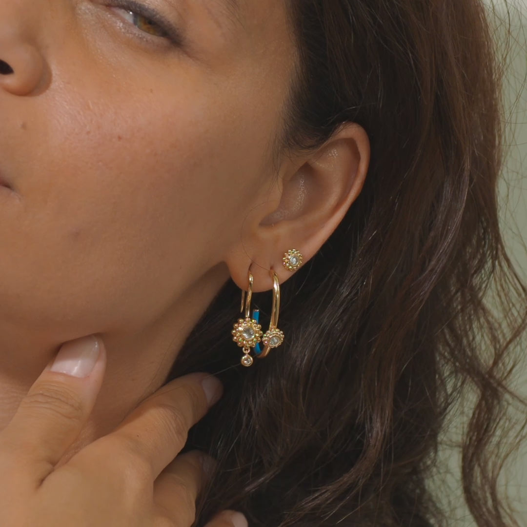 AK's 18k yellow gold 'Water' hoop earrings celebrate the sea urchin's delicate beauty, and complex sea urchin patterns lend themselves well to set an inverted diamond - the soft beading is reminiscent of vintage jewelry, and the inverted diamonds add a modern "punk" vibe and an architectural element to the sensual sea urchin. Together, these elements create a beautiful tension in design. The playful mismatched sea urchins add a lovely contrast to the turquoise water-blue enamel.