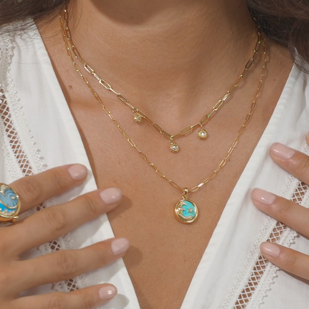 AK's 4 Elements Collection is inspired by her love for the natural world. The Ocean and Starfish are perfect symbols of the Water Element. The 'Water' Pendant Necklace has a Kazakhstani turquoise background for the diamond ocean wave and starfish. The Aquatic scene represents the Water signs Cancer, Scorpio & Pisces. AK continues the Water Element theme on the back of the pendant with an 18k gold sun.