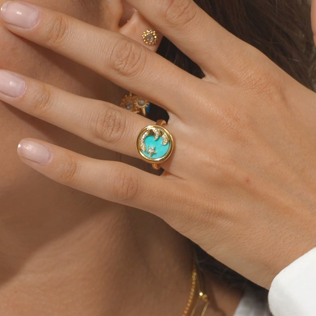 AK's 4 Elements Collection is inspired by her love for the natural world. The Ocean and Starfish are perfect symbols of the Water Element. The 'Water' Ring has a Kazakhstani turquoise background for the diamond ocean wave and starfish. The Aquatic scene represents the Water signs Cancer, Scorpio & Pisces. AK continues the Water Element theme on the back of the pendant with an 18k gold sun.